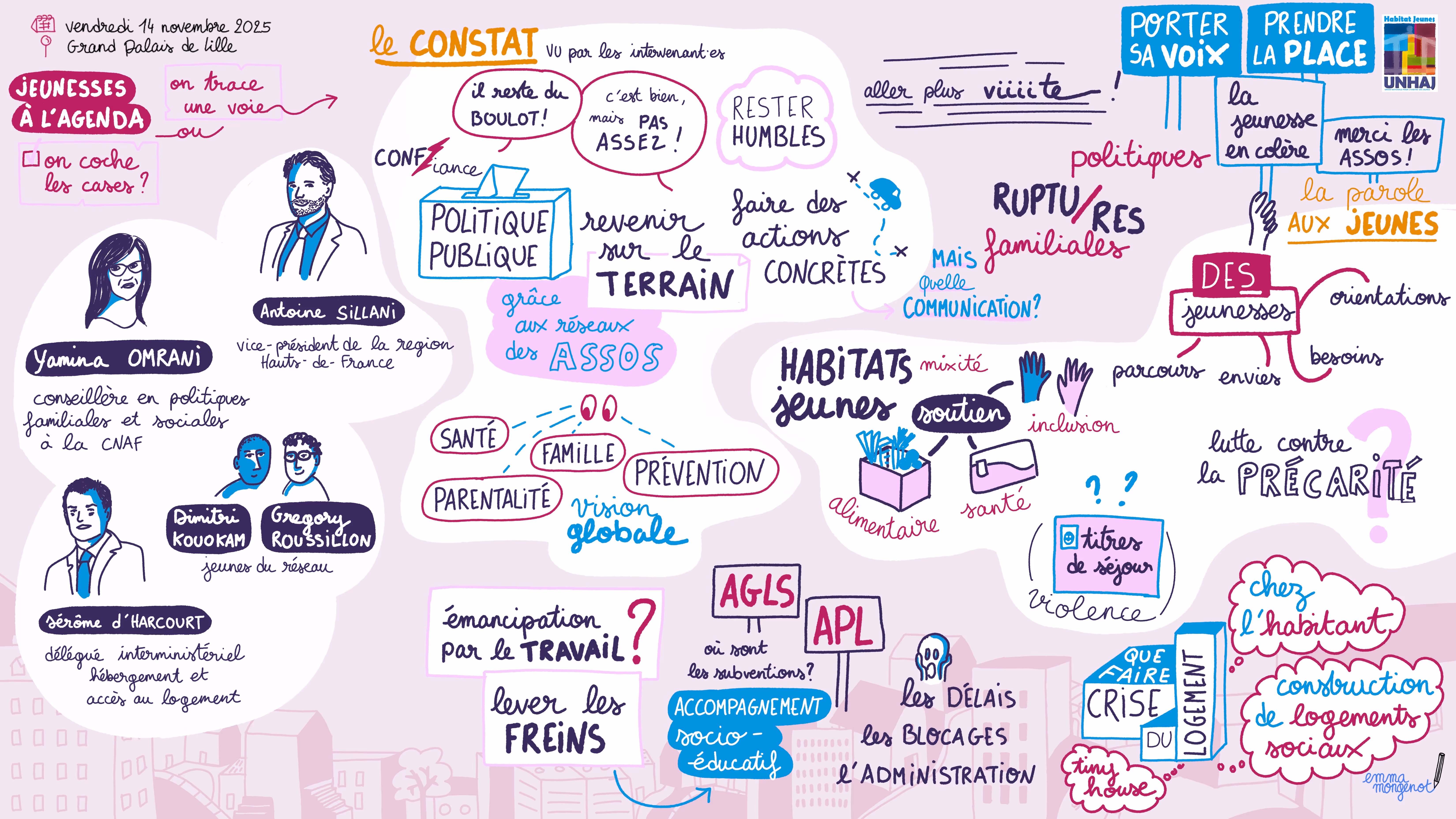 Installée face à la scène et aux intervenant·es, j'ai synthétisé les échanges refletant les visions historiques, économiques, politiques, institutionnelles et en donnant, bien sûr, la parole aux jeunes concerné·es. Au programme, trois tables rondes :