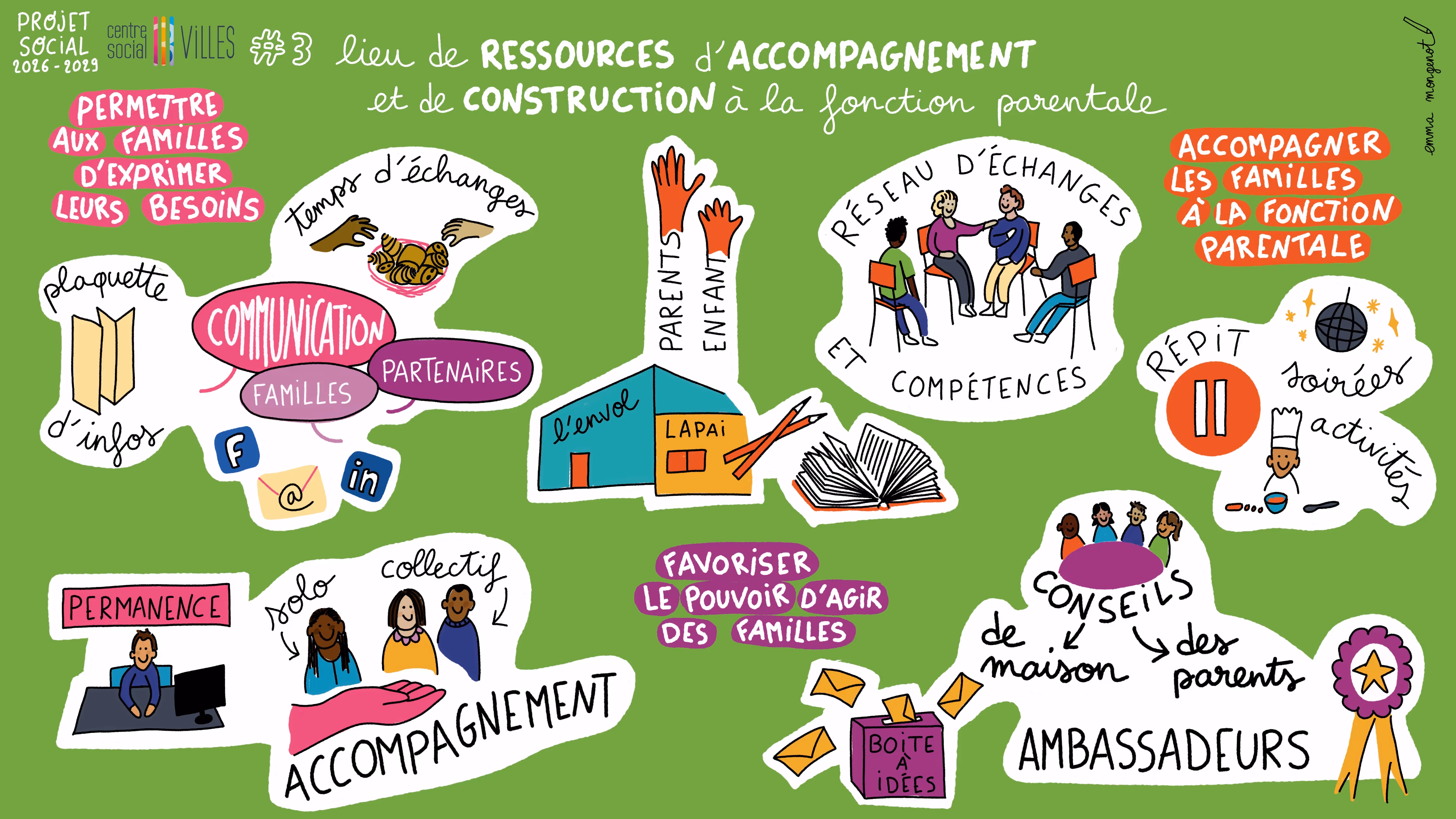 Le travail mené par les équipes du Centre Social 3 Villes sur le plan d'actions et les orientations stratégiques des prochaines années a conduit à la conception d'un document concret et conséquent. Leur besoin : transposer ce document en un support visuel agréable et accessible aussi bien pour les financeurs et institutionnels que par les bénéficiaires du centre social.
